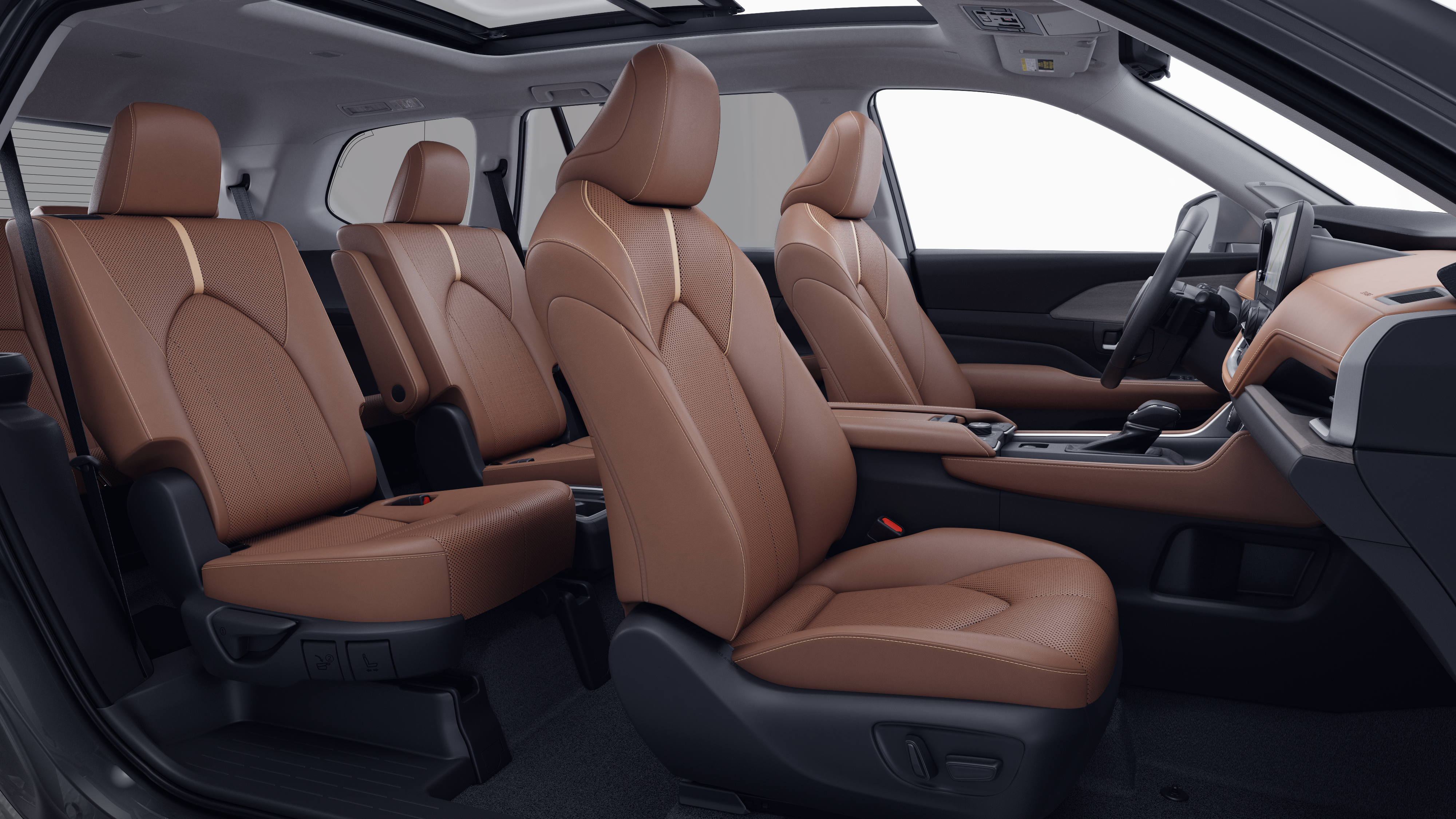 - 7-passenger seating with second-row fold-down captain's chairs and fold-down inboard armrests, adjustable headrests and two cup holders mounted on the floor; and 60/40 split, fold-down third-row seats with sliding headrests and recline function