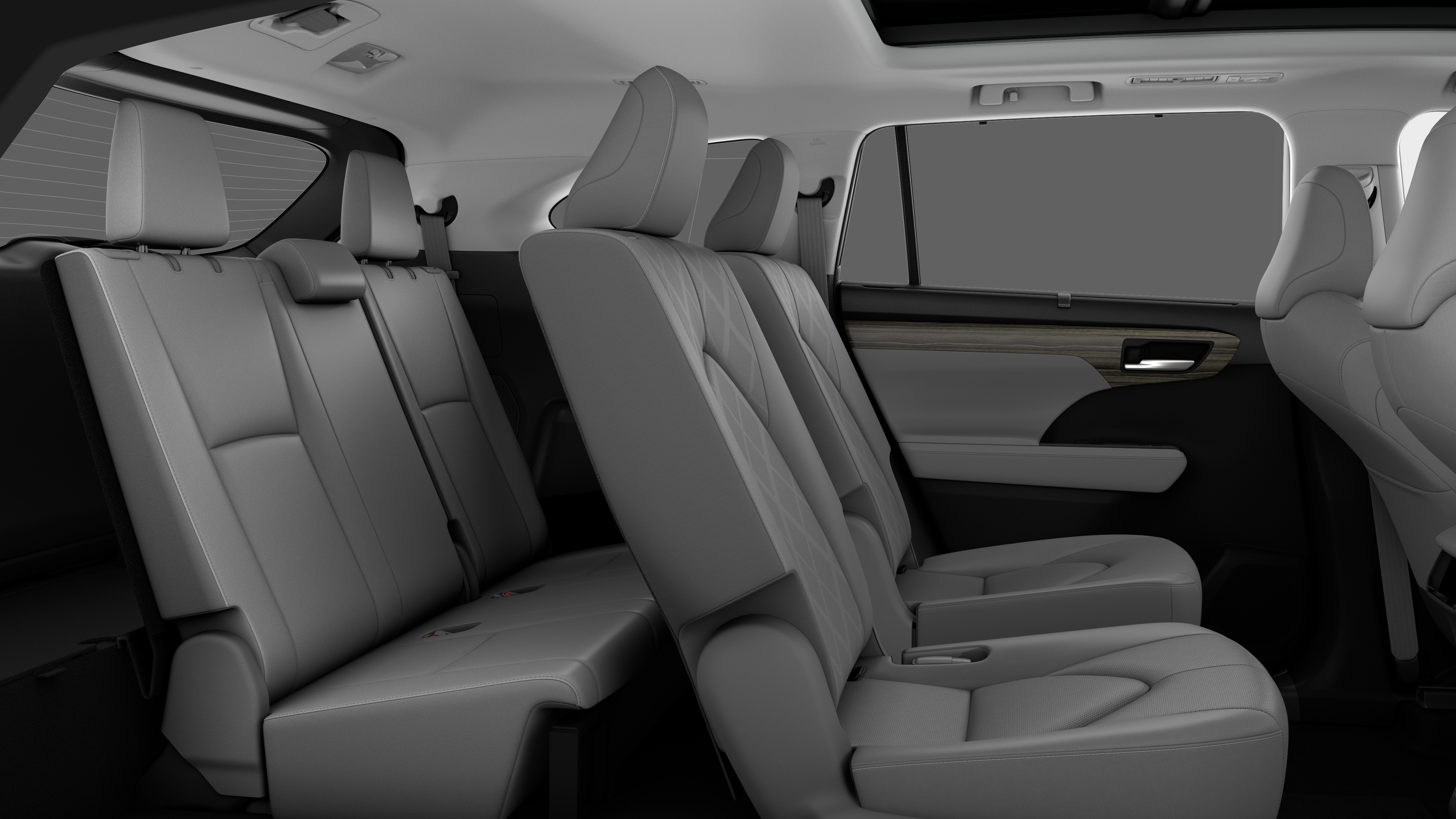 - 7-passenger seating with second-row fold-down captain's chairs and fold-down inboard armrests, adjustable headrests and two cup holders mounted on the floor; and 60/40 split, fold-flat third-row seats with sliding headrests and recline function